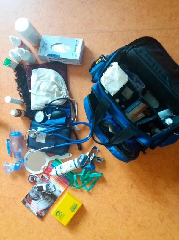Jedním ze základních úkolů je vytvořit si systém, který vám umožní se ve svém vybavení dobře orientovat, kdy se vám nestane, že u klientky postrádáte cokoli důležitého a zároveň že při odjezdu něco nezapomenete. Taška s vybavením by měla být lehká, ale pevná, nejlépe omyvatelná a voděodolná. Možností, jaký druh tašky si vybrat, je bezpočet a nemusí to být vůbec taška určená primárně pro zdravotníky, ale může se jednat klidně o tašku pro sportovní vybavení. Důležité je, aby se do ní lehce vešlo vše, co potřebujete, a abyste ke všemu jste měly dobrý přístup, který nejlépe zajistí dlouhé zipy, díky kterým je možné tašku zcela otevřít. Také je důležité, aby každé vybavení mělo své místo a bylo lehce dosažitelné bez zbytečného hledání a přehrabování. K tomu může pomoci dostatek kapes a příhrádek. Vzhledem k tomu, že taška může být docela těžká, je dobré myslet i na to, jakým způsobem se přenáší (jaký má popruh, může mít kolečka apod.)